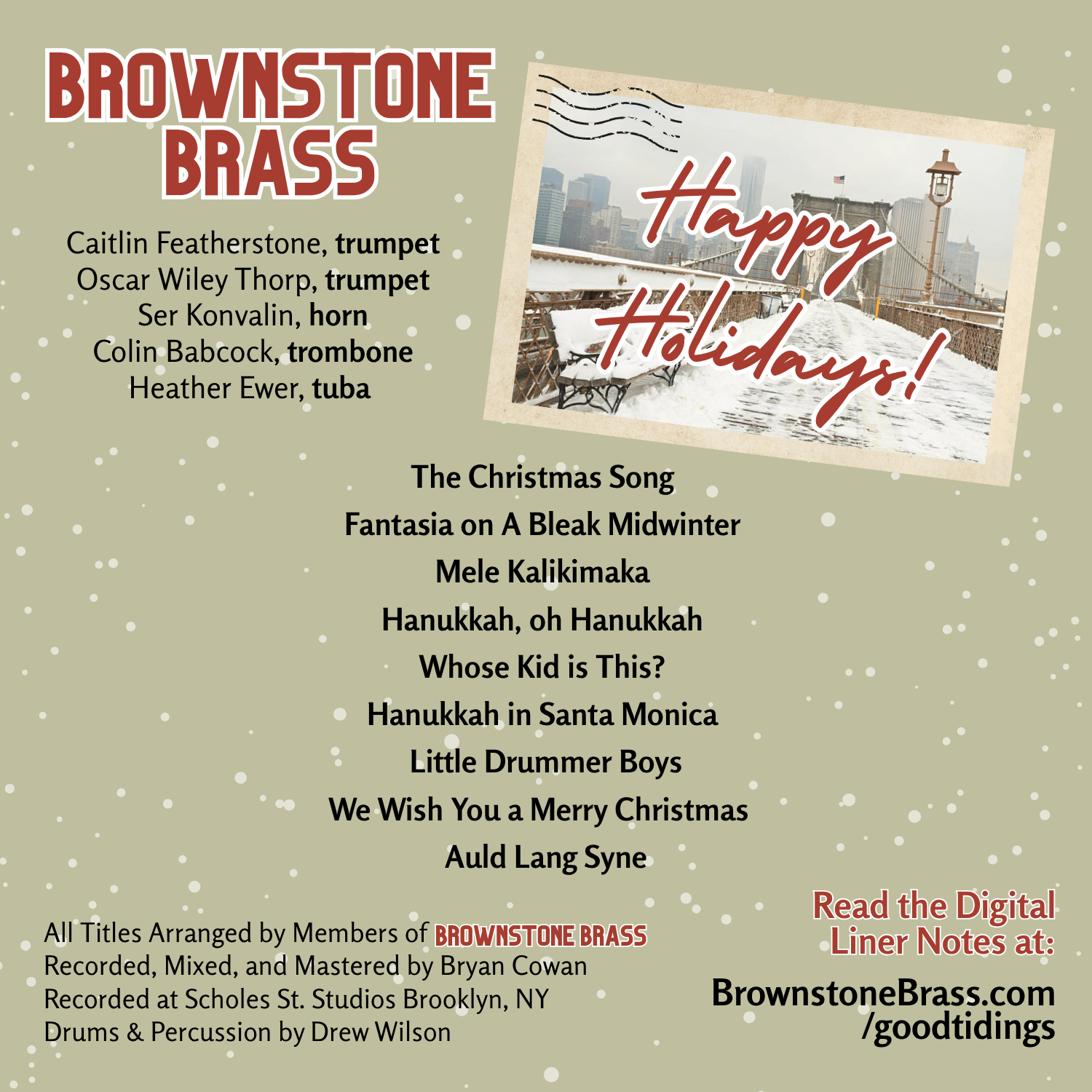 ‘Good Tidings’ was officially released on Sunday, November 23rd. This premier album consist of nine holiday favorites arranged by the members of Brownstone Brass. The album is available for streaming wherever you get your music and is available for purchase on CD or Vinyl here!